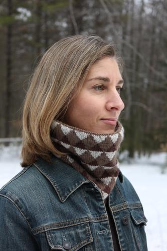 The cowl is provisionally cast on and knit in the round in a diamond stranded pattern. Next the colors of the diamond pattern are switched as you knit the last half. Then the ends are grafted together with a three needle bind off.